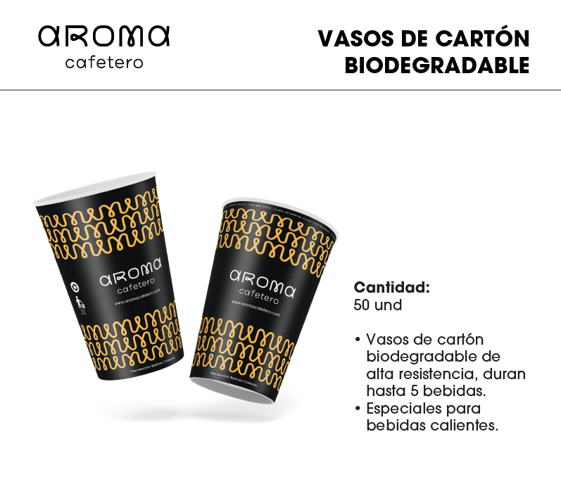 Vasos desechables de cartón biodegradable de alta resistencia, duran hasta 5 bebidas.