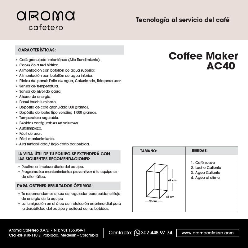 Disfruta de una experiencia rápida y eficiente con nuestra máquina de café automática 4 bebidas (Café instantáneo), diseñada para lugares con alto flujo de personas. Este equipo permite preparar múltiples opciones con un solo toque, brindando siempre la consistencia y calidad que tus clientes necesitan. Con un depósito amplio y un sistema de temperatura ajustable, garantiza la extracción óptima y un sabor inigualable en cada taza.