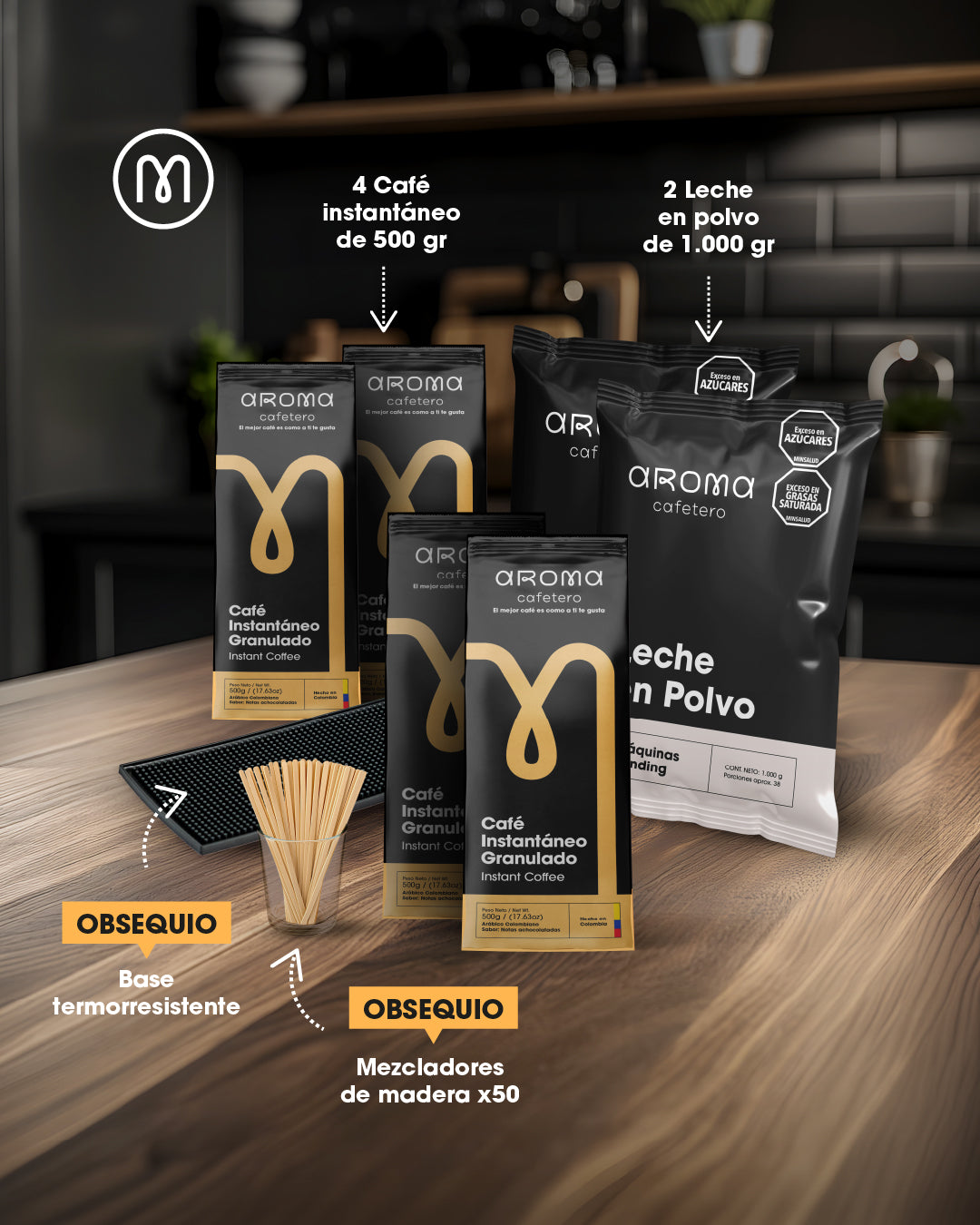 Incluye: 4 bolsas de café instantáneo de 500 gr c/u, 2 bolsas de leche en polvo y mezcladores de madera.