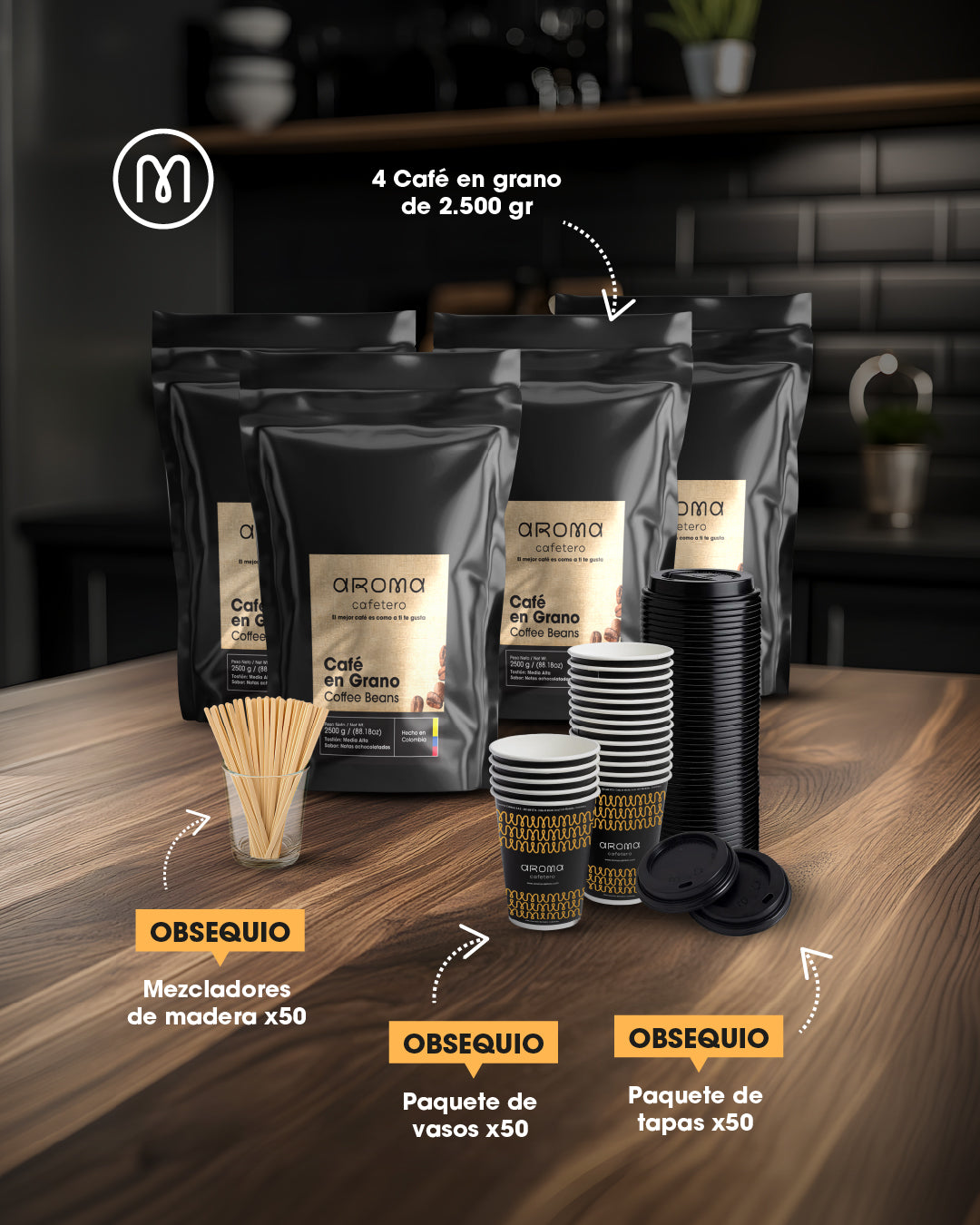 Incluye 4 bolsas de café en grano de 2,500 gramos totales, 50 vasos desechables con tapas herméticas y mezcladores de madera.