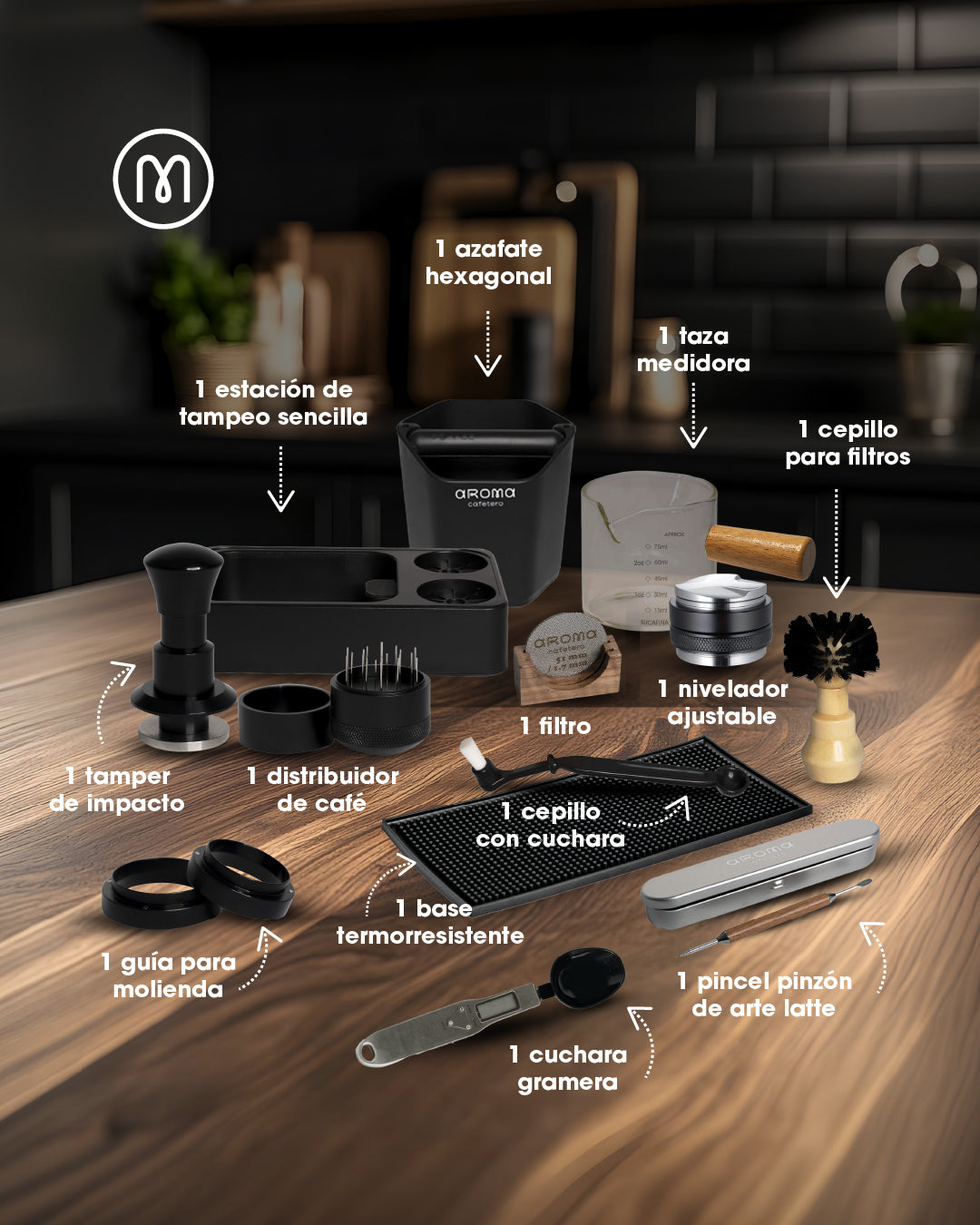 Incluye 13 herramientas esenciales: azafate hexagonal, base termorresistente, cepillos especializados, cuchara gramera, distribuidor de café, filtro, guía de molienda, pincel para arte latte, tamper de impacto, taza medidora, nivelador ajustable y estación de tampeo.