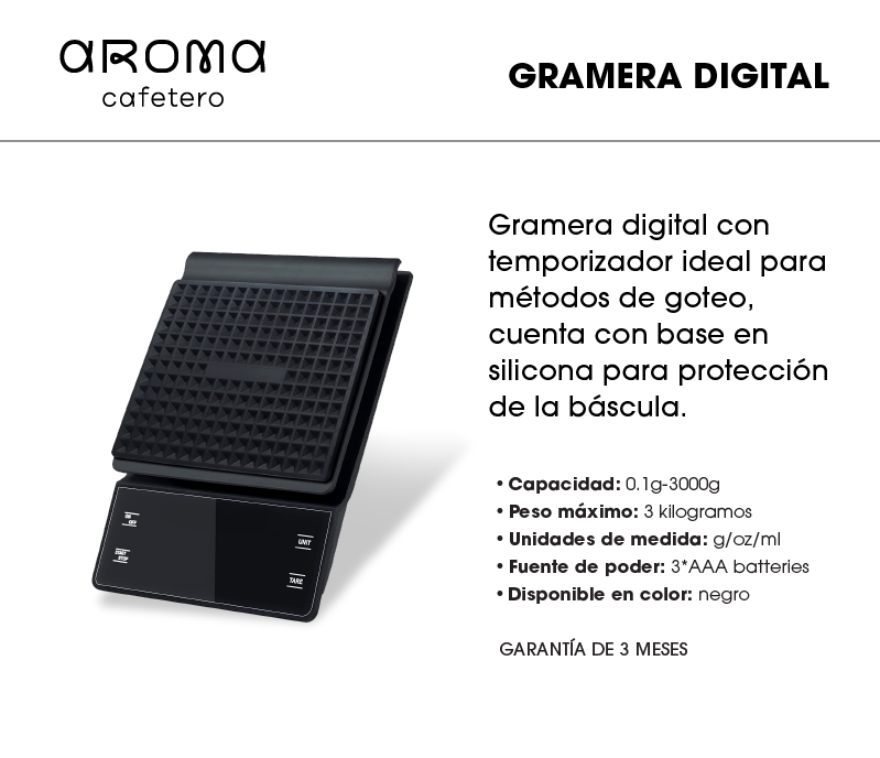 Gramera digital con temporizador ideal para métodos de goteo, cuenta con base en silicona para protección de la báscula.